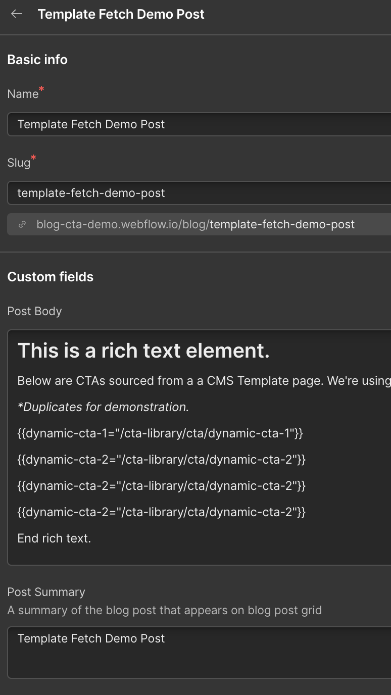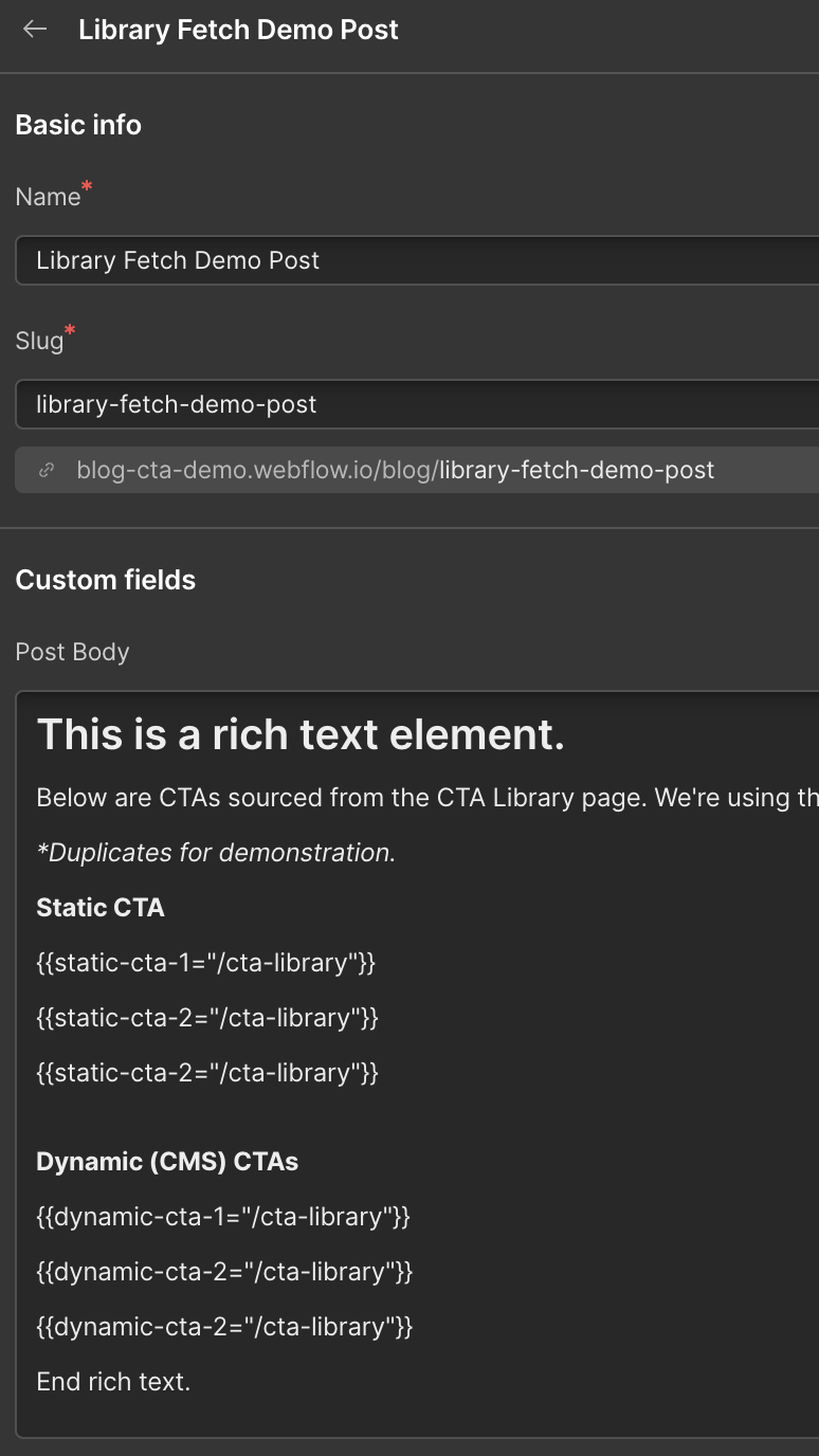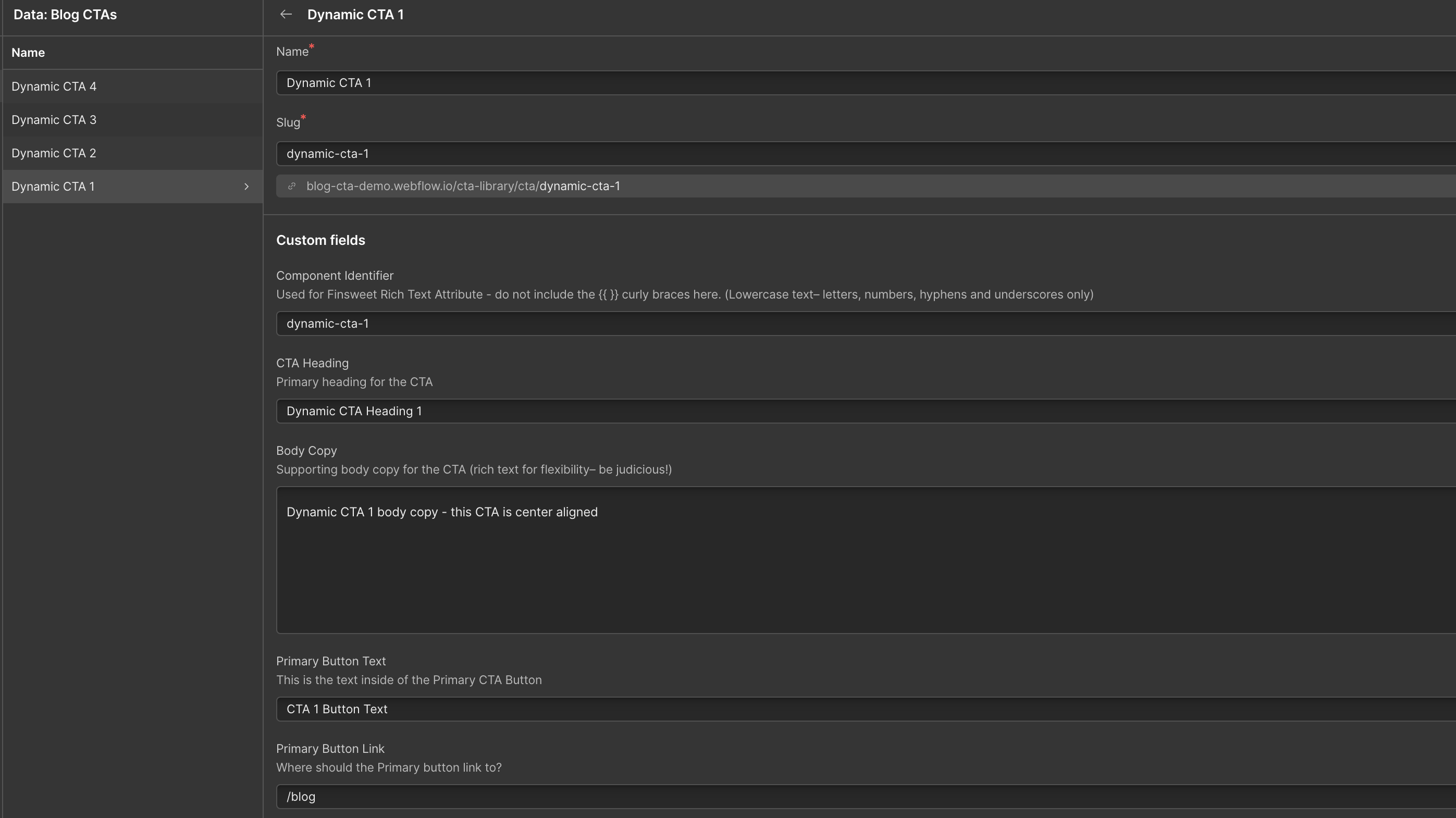 Beginning to End: Create a flexible CTA component (or copy the example here as a starter!). Create a collection list with the appropriate fields. Add the new flexible component to a collection list and map the fields. Then, call the CTA into your posts, using the component identifier in whichever way fits your use case best.